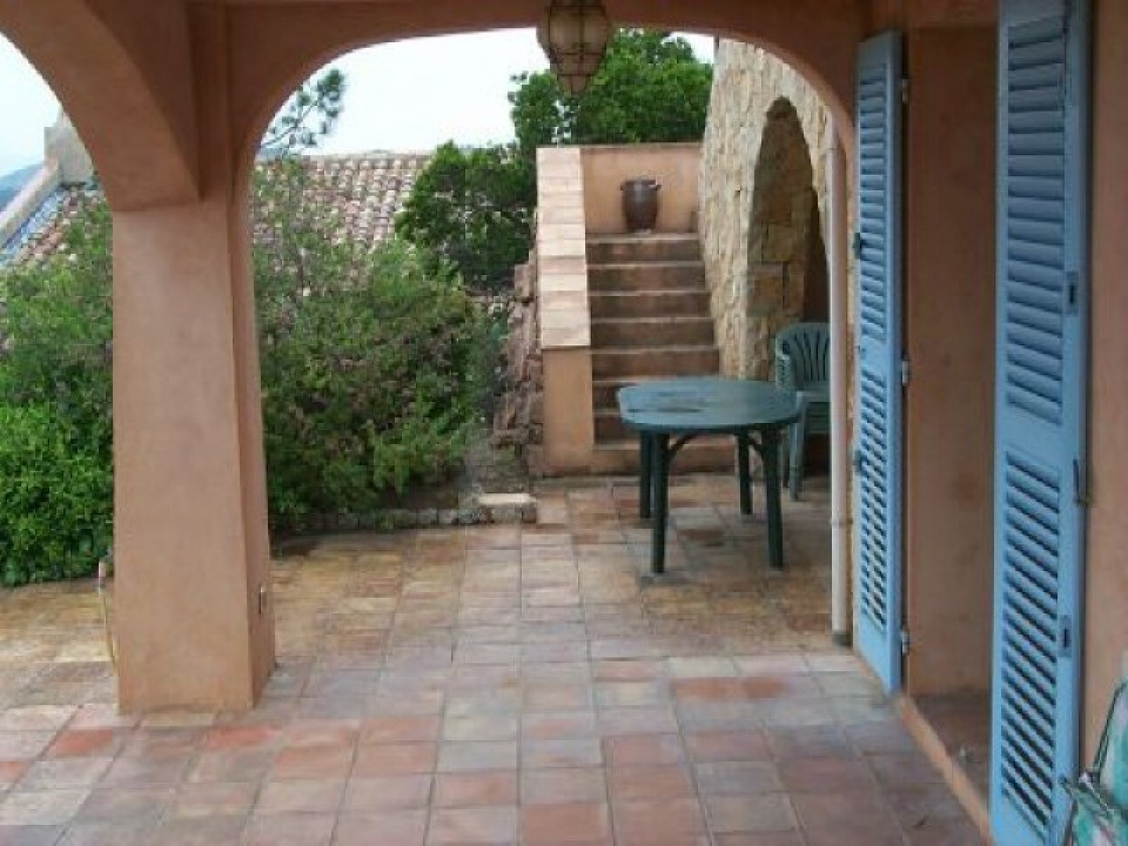 La position de cette belle villa sur les contreforts de l Estérel, lui permet d' avoir une magnifique vue mer , panorama agrémenté par les pointes de la Baumette, du Dramont et même dans le fond, la presqu île de Saint Tropez. La maison voisine bénéficie d' un droit de passage et de stationnement sur la plateforme haute. Les locataires doivent de ce fait garer leur voiture sur le parking inférieur. Terrain non clos.